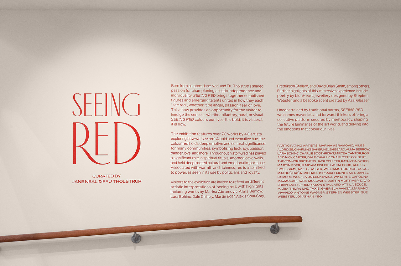 SEEING RED is a dynamic exhibition born from the curators’ shared passion for championing artistic independence and individuality. This exhibition brings together established figures and emerging talents, fostering an environment that values innovation. The works showcased in the exhibition are united in their examination of the notion of ‘SEEING RED’ and when presented in the exhibition alongside one another, create a dialogue that encourages viewers to reassess the current art landscape and its connection with the remarkable talents on display. From painting and sculpture to poetry, jewellery and scent, this exhibition presents visitors with an experience to stimulate all the senses. Unconstrained by traditional norms, SEEING RED welcomes mavericks and forward-thinkers, offering a collective platform secured by meritocracy, shaping the future luminaries of the art world, and delving into the emotions that colour our lives. This exhibition serves as a re-examination of contemporary art, emphasising an artist’s autonomy in an increasingly prescriptive art world. Beyond the visual, SEEING RED engages other senses, providing a unique perspective on art that transcends traditional boundaries.